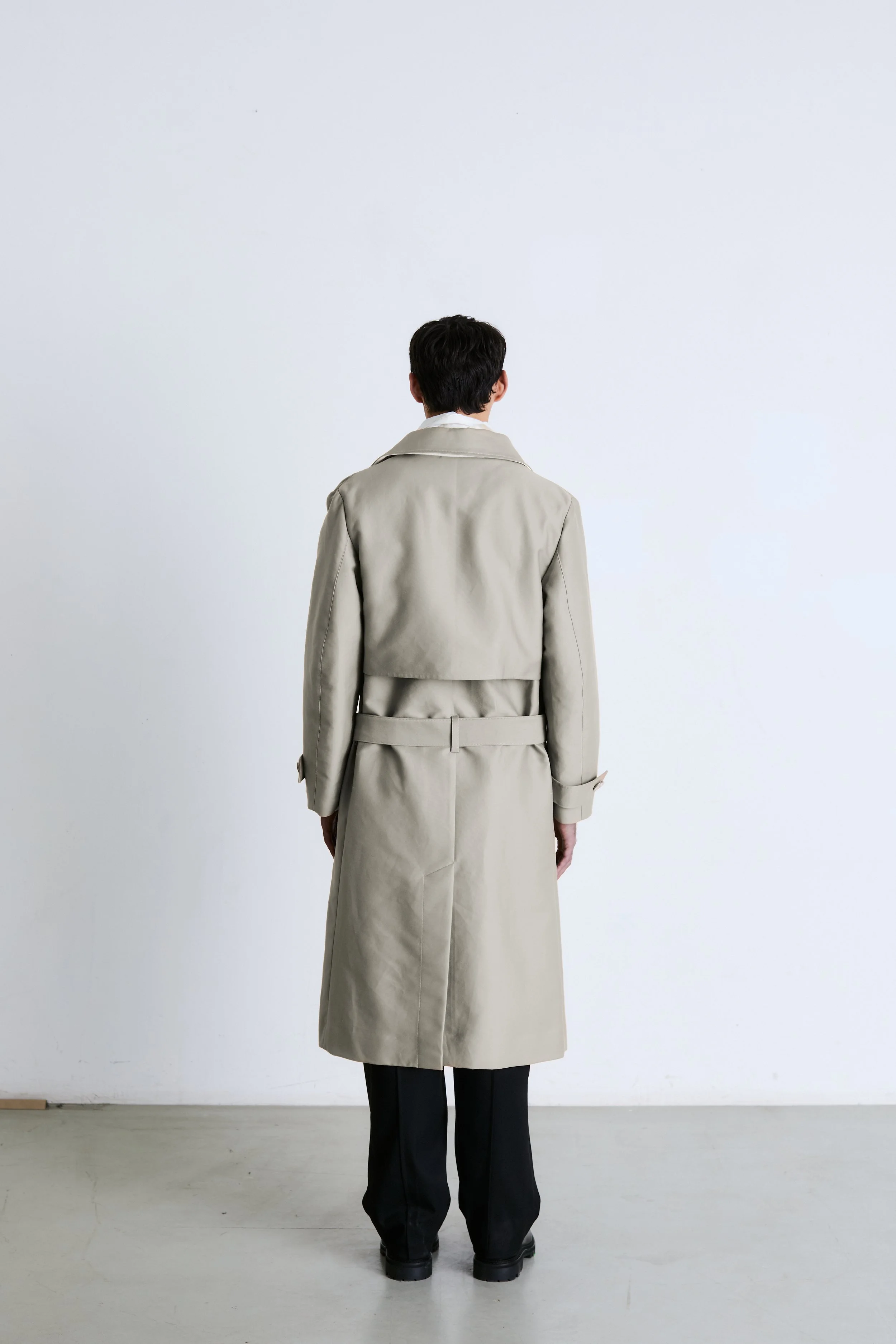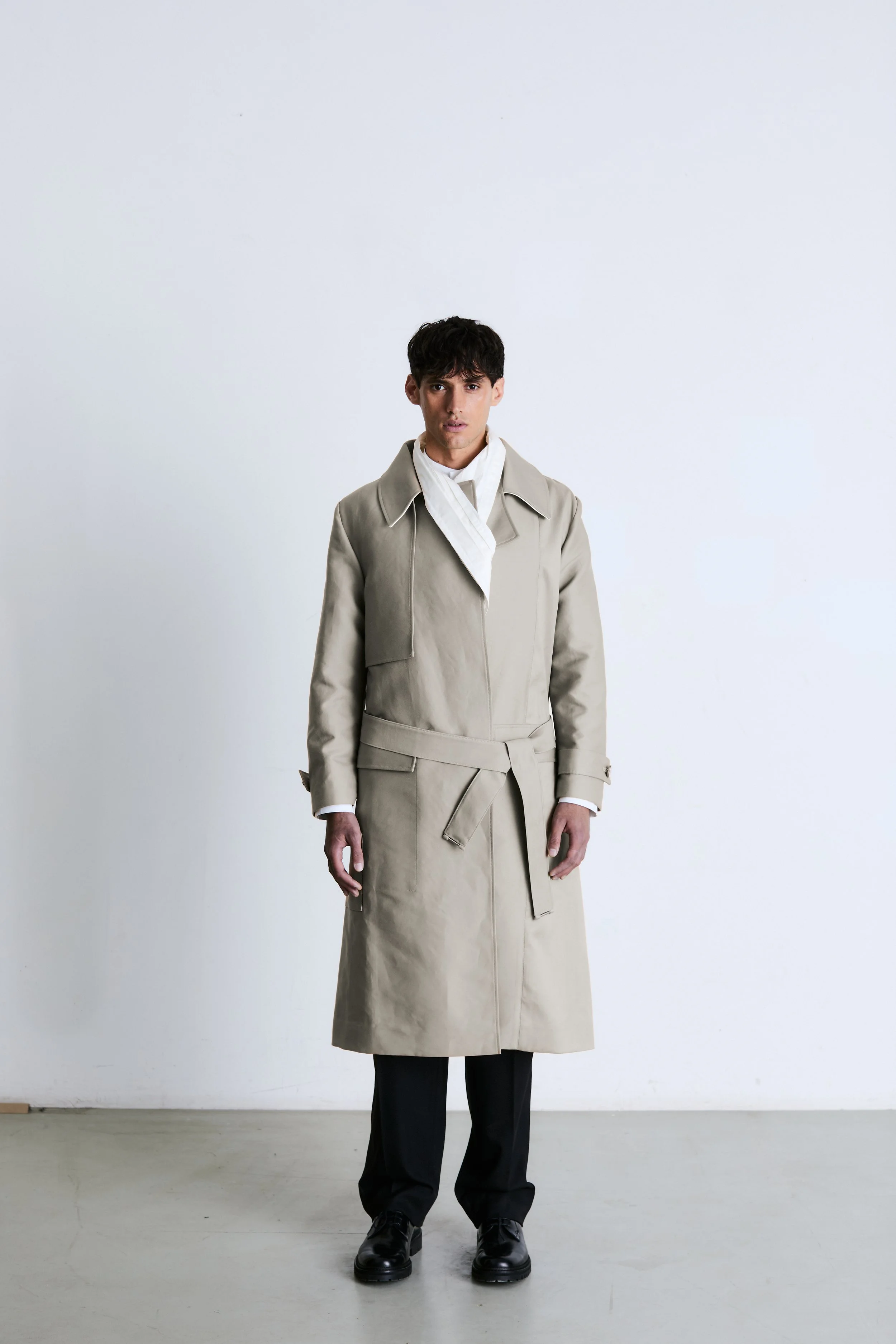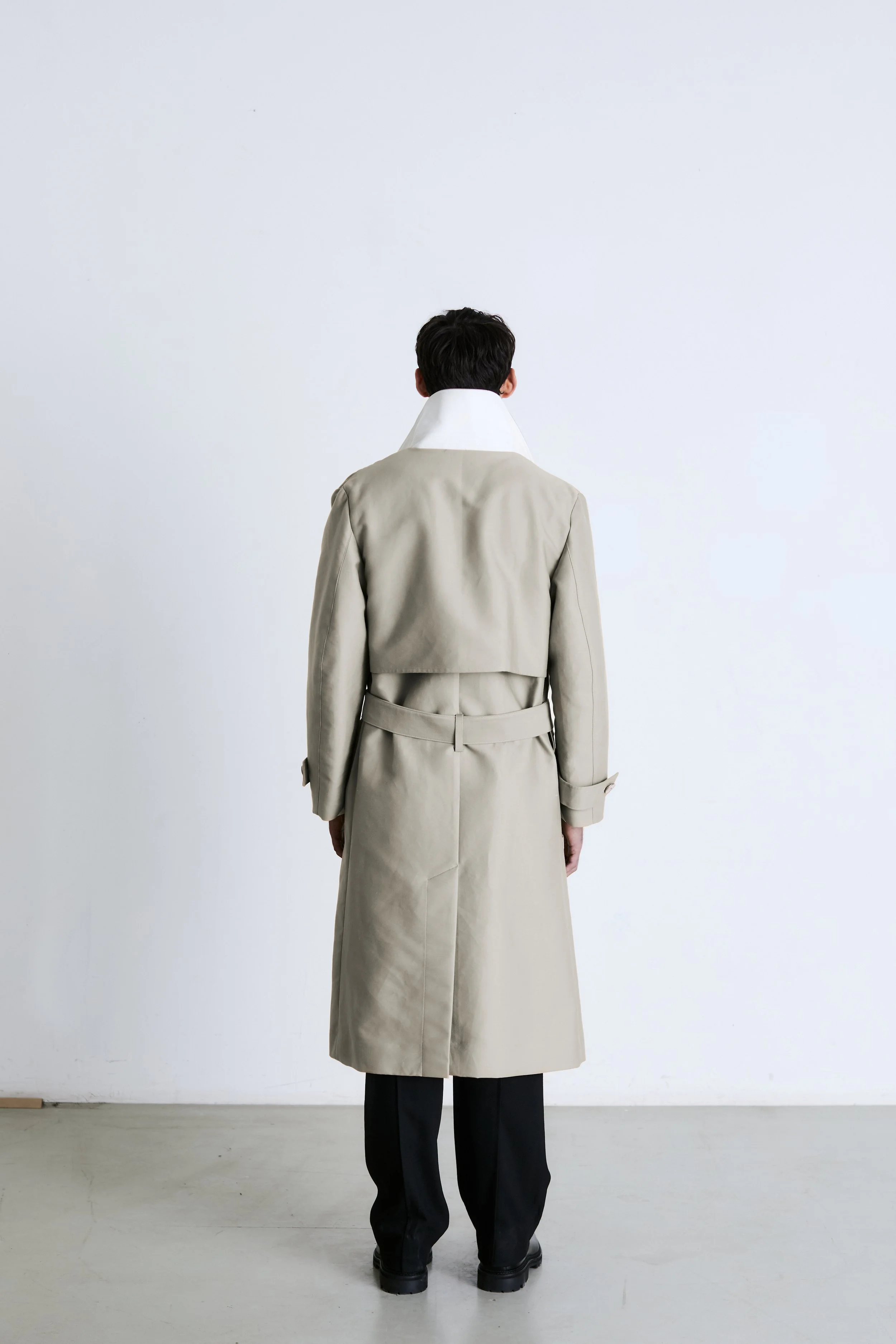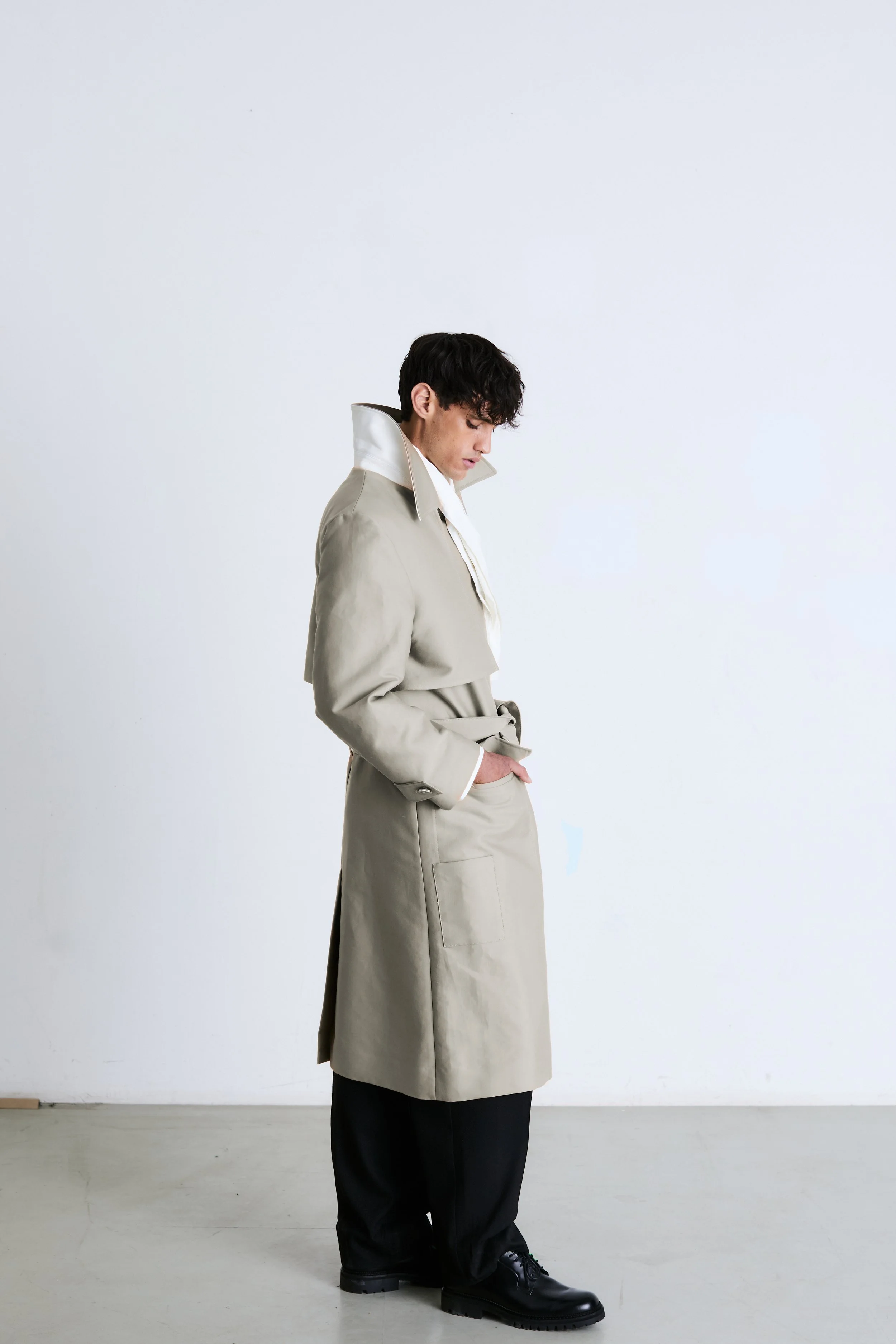 100% Double-Faced Cotton Twill in Slate and Stone. White Calf Leather Under-collar. Laser engraved “Die Neue” buttons and steel embellishment on coat belt.