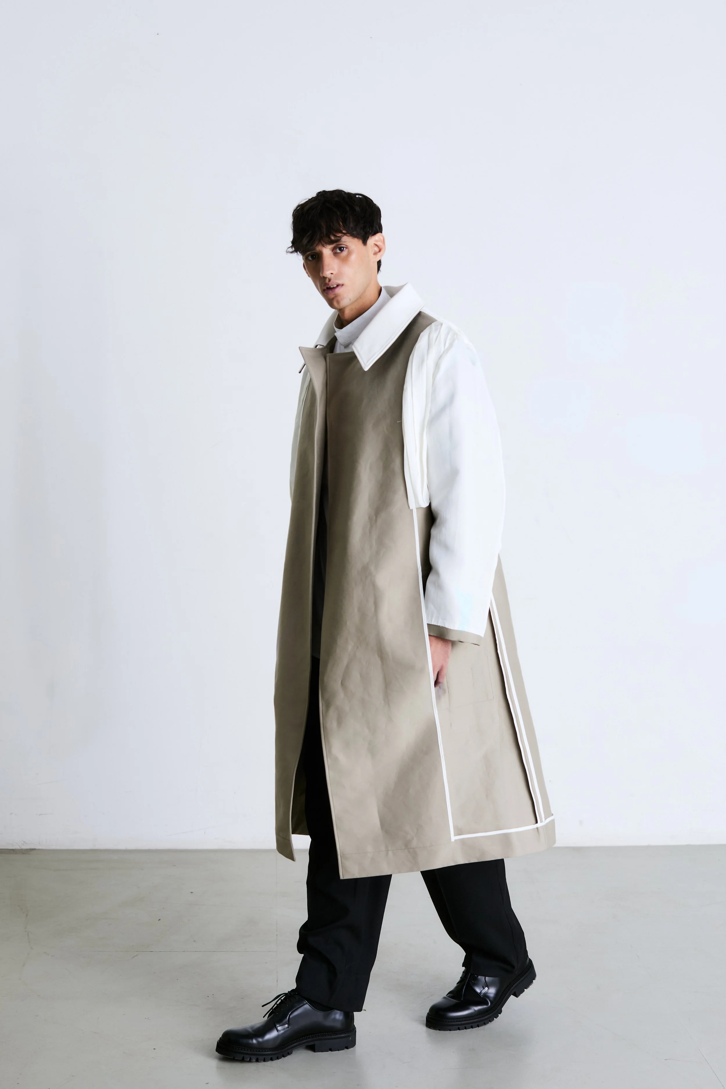 The trench coat's two-toned, double-faced cotton twill echoes the compositional works of Laszlo Moholy-Nagy, playing on the theme of similarly colored rectangular shapes that overlap and interact. This inspiration continues with the invisibly topstitched pocket and the oversized pocket flap.
