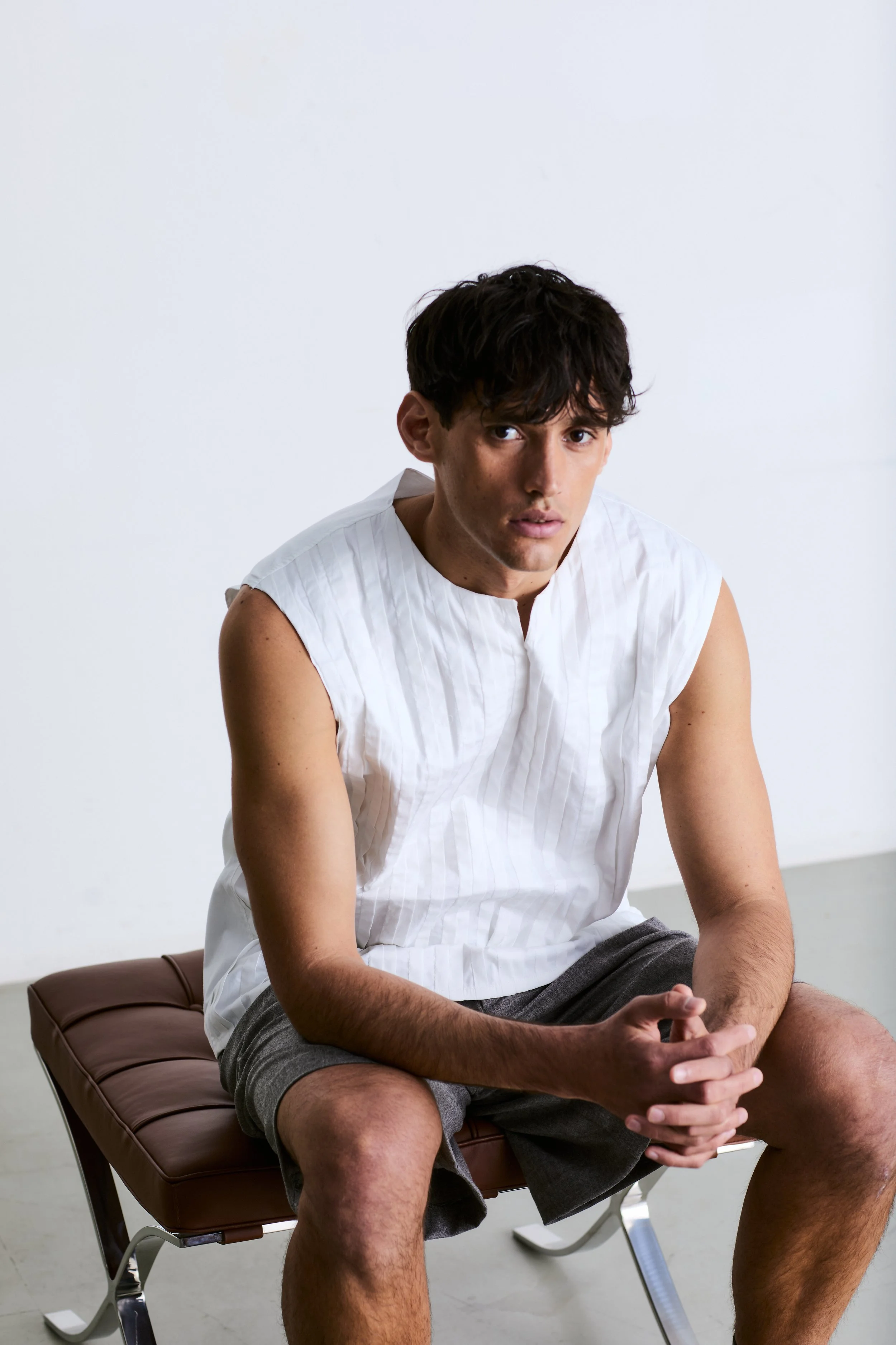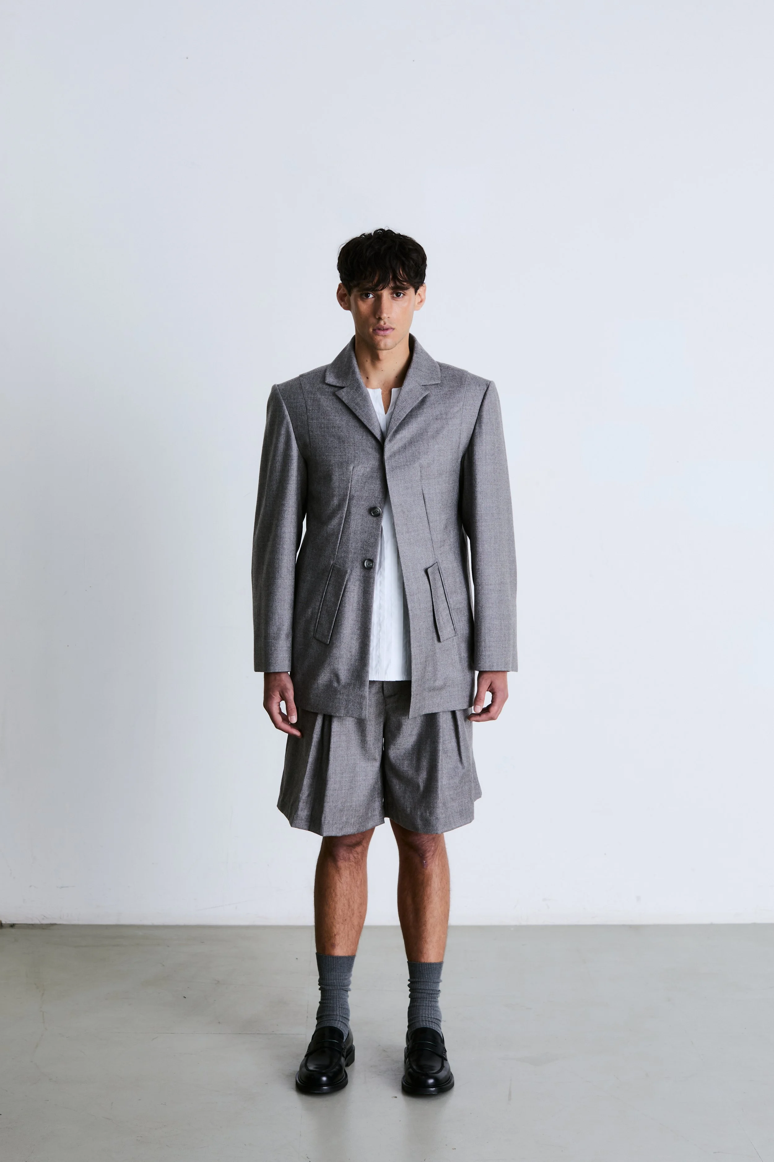 Look Two features a 100% fine Italian wool flannel blazer with a distinctive reachback design, paired with inverted pleat knee-length shorts and a pin-tucked cotton sleeveless shirt. This outfit draws inspiration from the iconic "Filzanzug" (Felt Suit) by German artist Joseph Beuys, created in the 1970s.