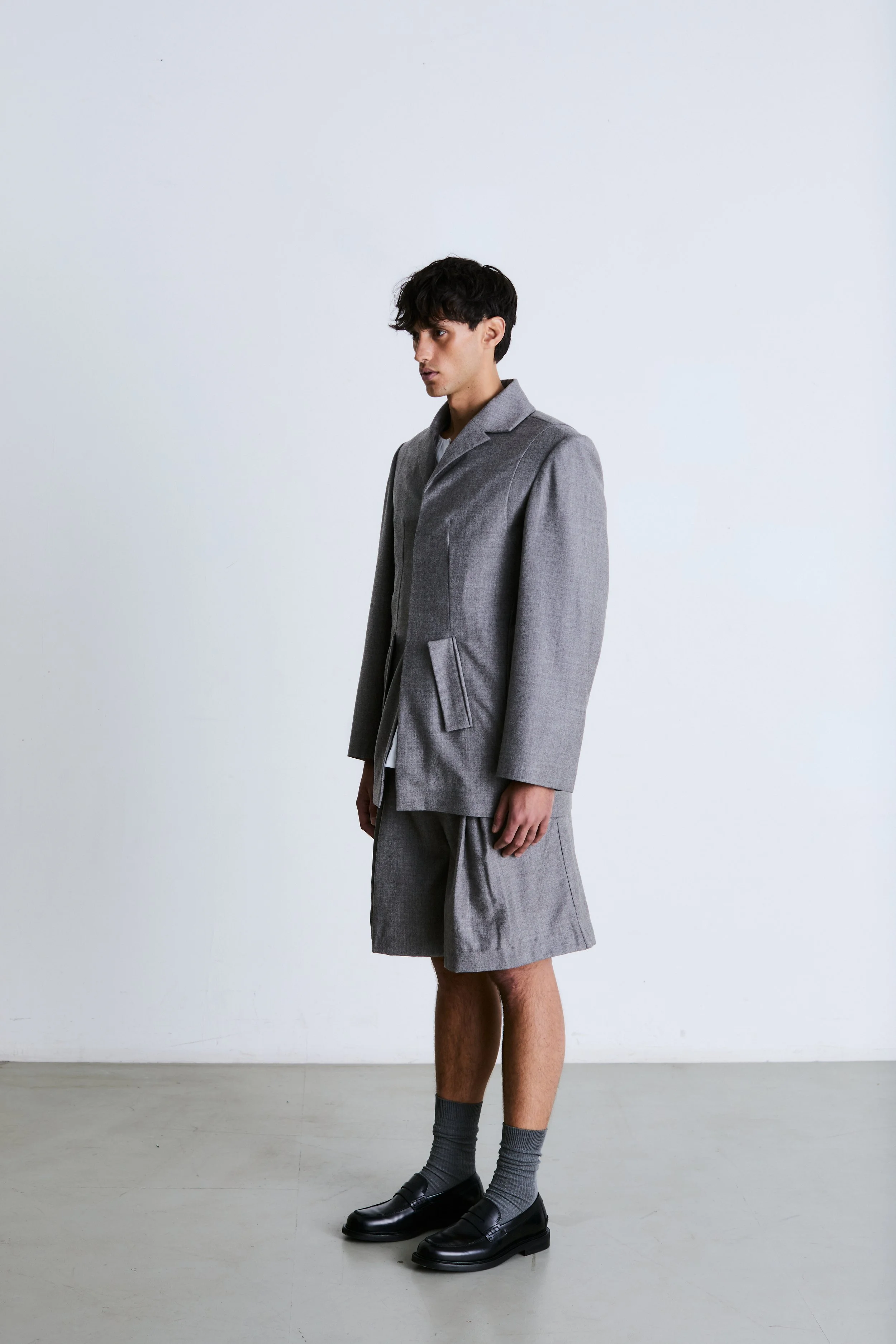 The design choices, such as the reachback on the blazer and the inverted pleats on the shorts, aim to evoke the image of an angel in spiritual form, blending everyday attire with the daily practices of my grandmother and Joseph Beuys.
