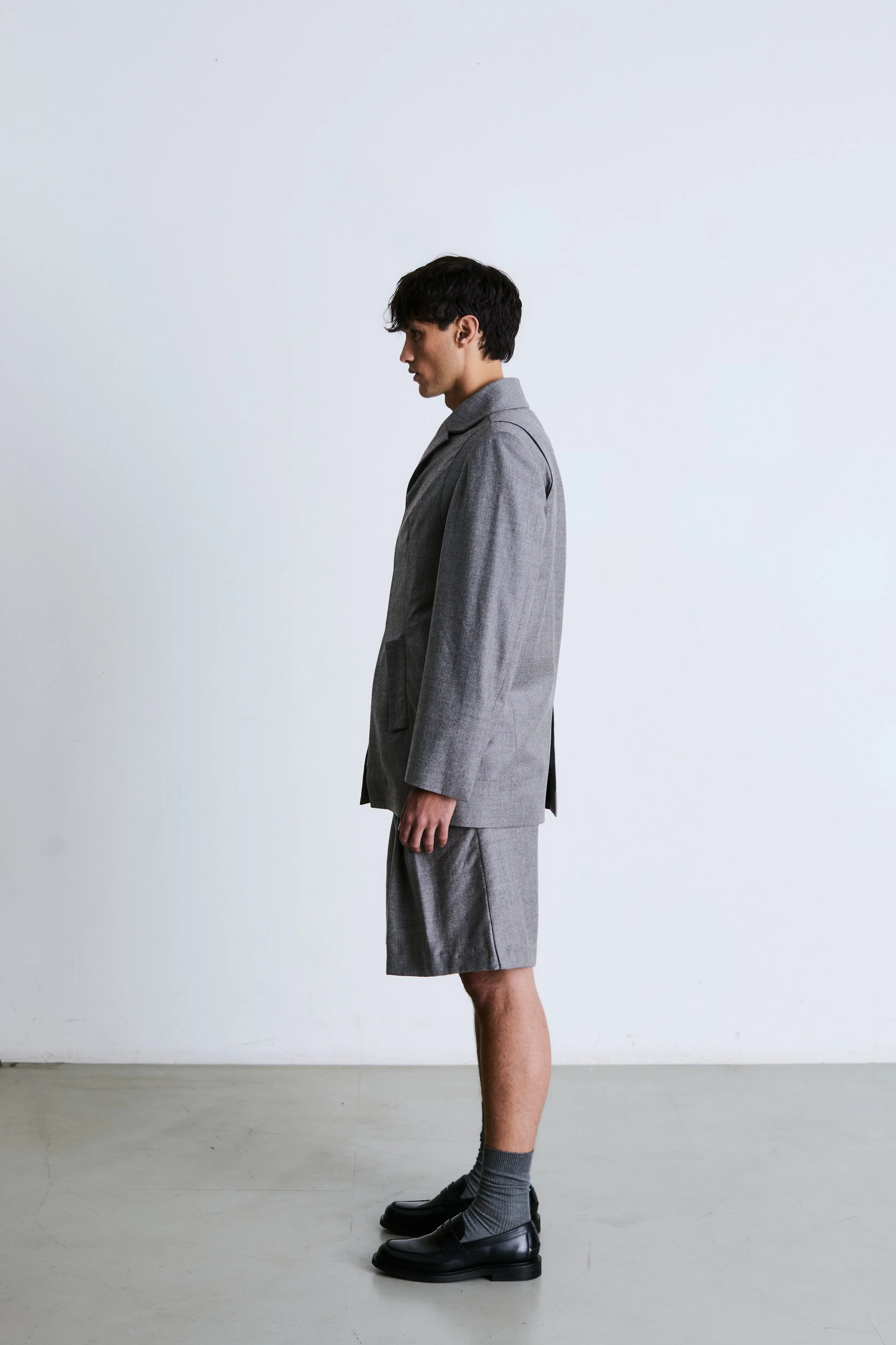 100% Fine Italian Wool Flannel in Gray. Double Welt Pockets with Flap. Hidden Horn Buttons. Reach-back design detail at Shoulder. Center back vent.